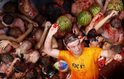 Some time ago I made fun of the fools at the running of the bulls in Pamplona, bemoaning our cultural heritage and the apparently missing common sense gene, whereupon Danny produced the exciting Tomatina Festival that was celebrated today in Spain, which, I must say, looks about as bloody as the bull run, but infinitely more fun.