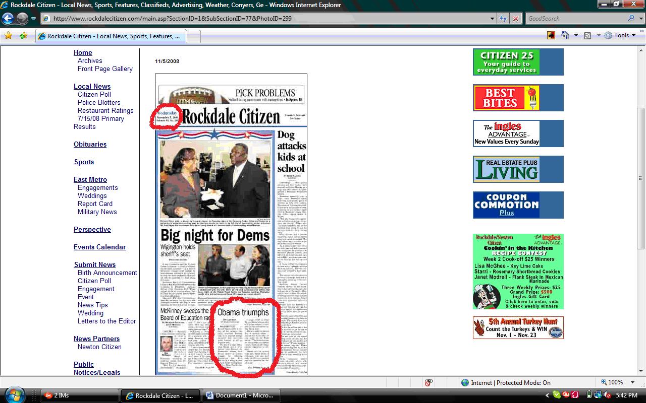 Yep. You guessed it. That’s my hometown right there, and that’s our paper, the Rockdale Citizen. Beautiful. Dare I defend them and say that local politics trumps national politics? I think I will. The local races are important to us. They really are. And somebody said somewhere that real politics are the local politics. So I said it. I even believe it. But still, daaaaammmmnnnn. I didn’t vote for Obama, but I can surely appreciate the historic nature of the election. Bahaha.
