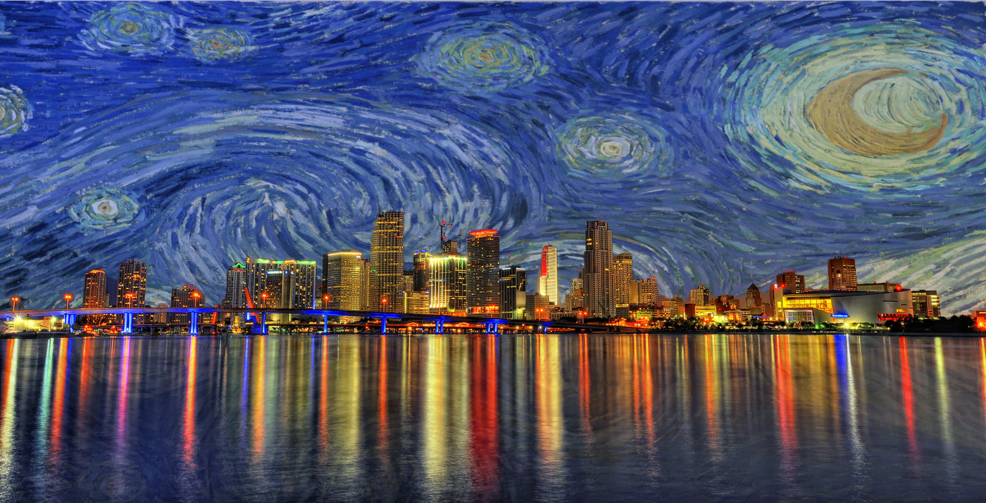 My cousin Gabriel Trujillo made this picture a little while ago. I loved it so much I asked him for permission to post it here, so there you go, gentle readers, you have the perfect juxtaposition of two things I love — Miami, and Van Gogh.