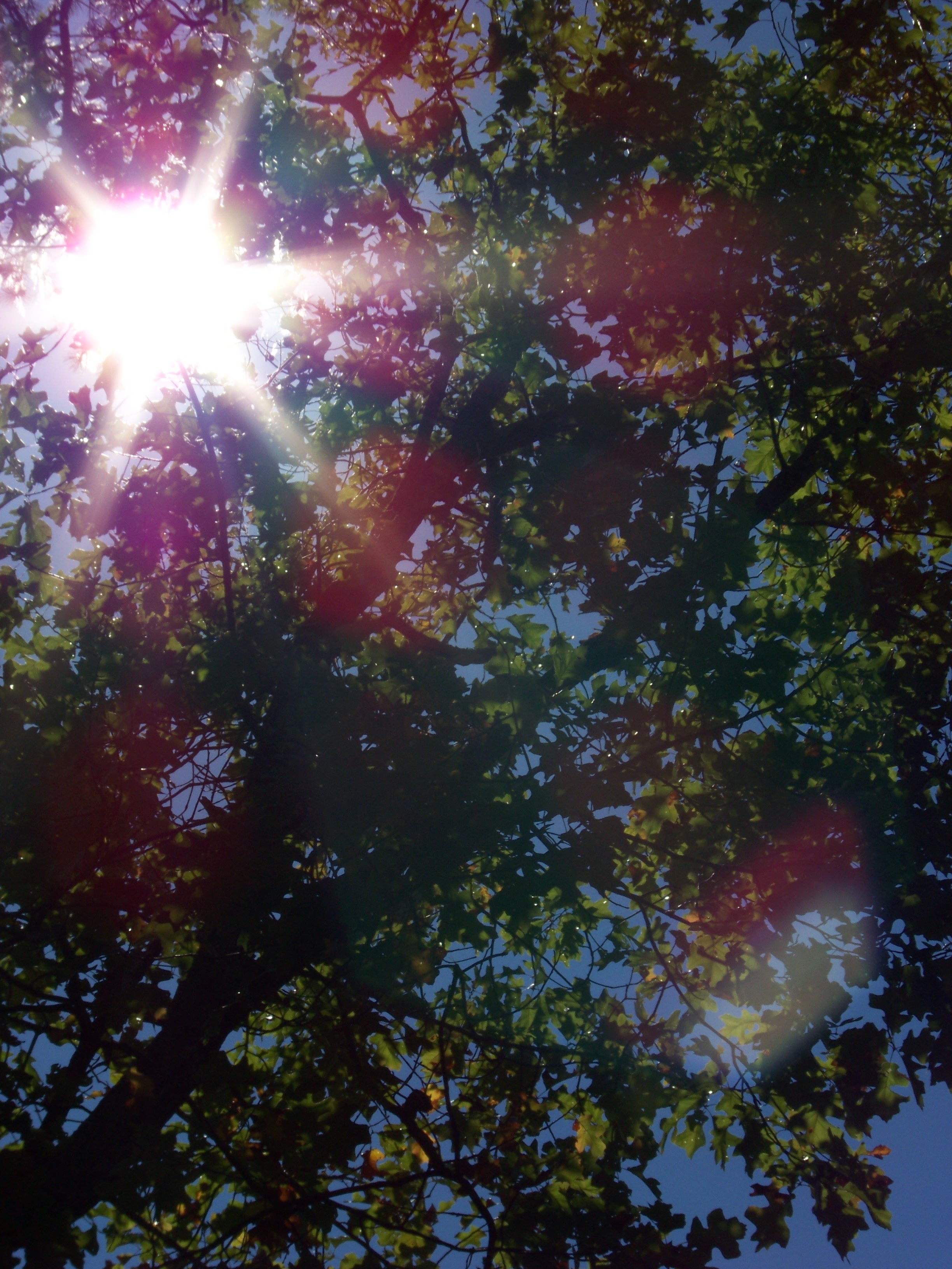 The sun was kind of low in the sky and it made everything seem like it was filmed in Technicolor. The blue, cloudless sky was so blue. The green leaves were so green. And the sun?