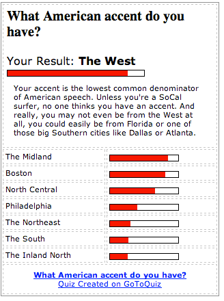 So, although I’m from Baltimore and I have that accent, the quiz told me that I have a Midland accent. And, gee, it sounds much like the West accent: “You have a Midland accent” is just another way of saying “you don’t have an accent.” You probably are from the Midland (Pennsylvania, southern Ohio, southern Indiana, southern Illinois, and Missouri) but then for all we know you could be from Florida or Charleston or one of those big southern cities like Atlanta or Dallas. You have a good voice for TV and radio.”