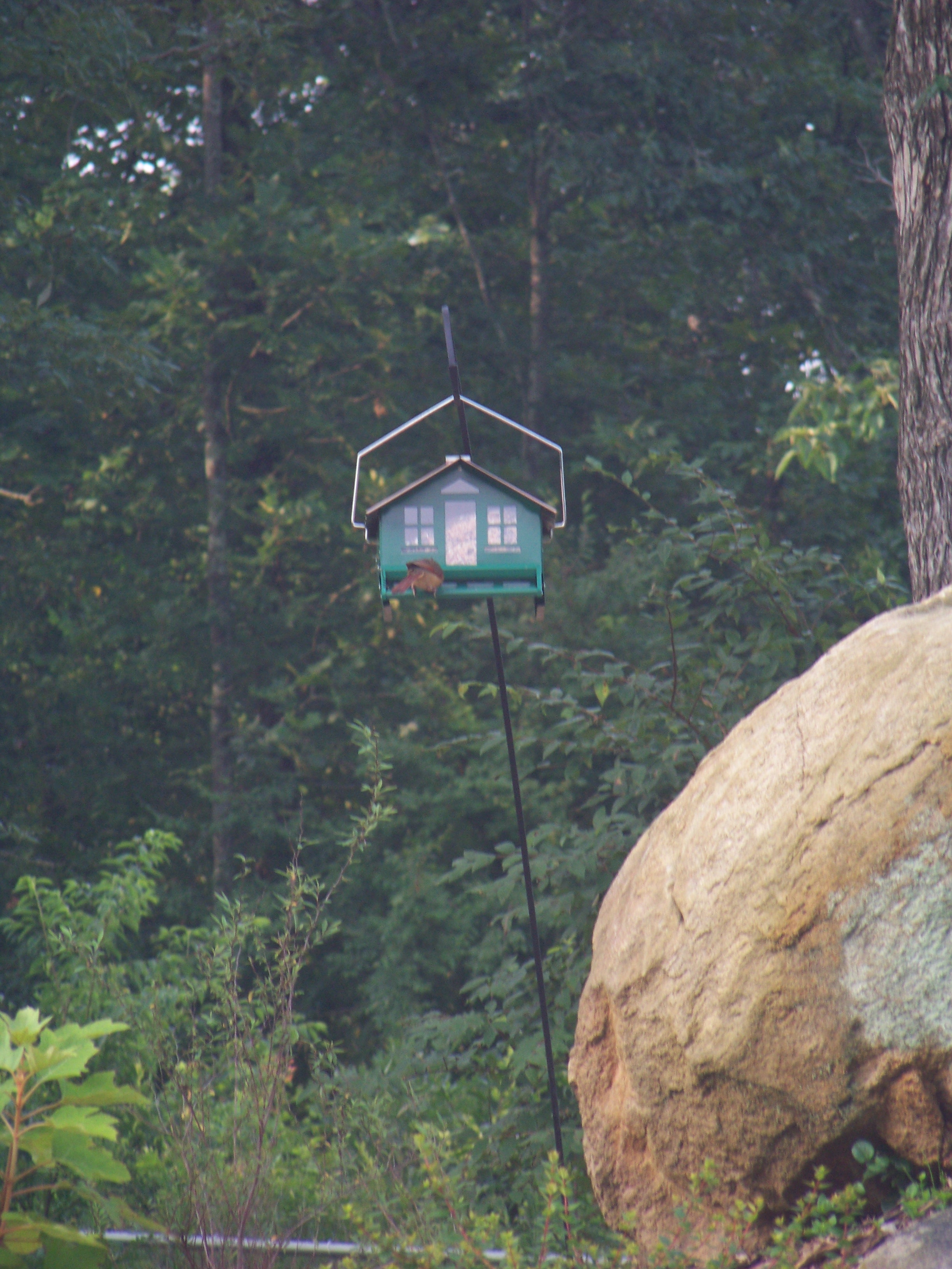 He observed that the red feeder, easily accessible and overflowing with feed that comes out so quickly it not only feeds a variety (and a ton!) of birds, but even the squirrels and chipmunks are feasting on the excess.