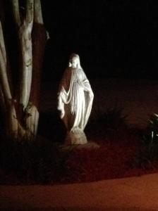 I finally decide it’s me, and suddenly the little spotlight on the Blessed Virgin that sits in a corner of my patio turns on. A little beacon in my garden, and tonight, a little more, as I fancy the Blessed Mother nodding and winking at me from her little perch in the monkey grass.
