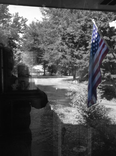 This picture is a selfie, a reflection of my front yard off the glass storm door. Every time I walk through this way, I adjust the American flag that we fly proudly on our front porch. The wind blows into the corner and tends to catch the flag and flip it once, sometimes twice, around the post before I notice it and straighten it up again.